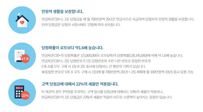 3억원 이상의 다른 복권들은 세금을 33%를 내야 하는데요, 연금복권은 22%의 세율로 좀 더 세금을 적게 낸다고 할 수 있습니다.