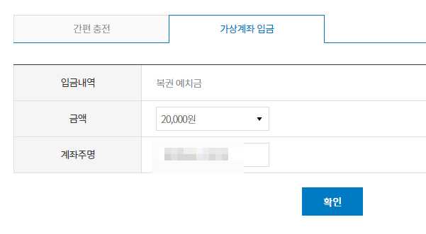 4) 가상계좌입금은 휴대폰 번호로 인증을 통해 가상계좌를 부여받고, 해당 계좌로 송금을 하는 방식으로 충전이 됩니다. 휴대폰번호를 입력하고 인증을 눌러줍니다.