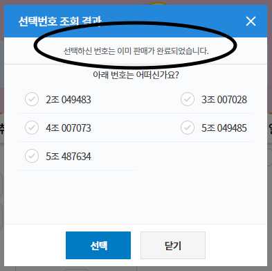 9) 해당 번호가 이미 판매가 완료된 경우에는 사진과 같은 알림창이 뜰텐데요, 다른 번호를 추천해주기도 하니 참고를 해주시면 됩니다.