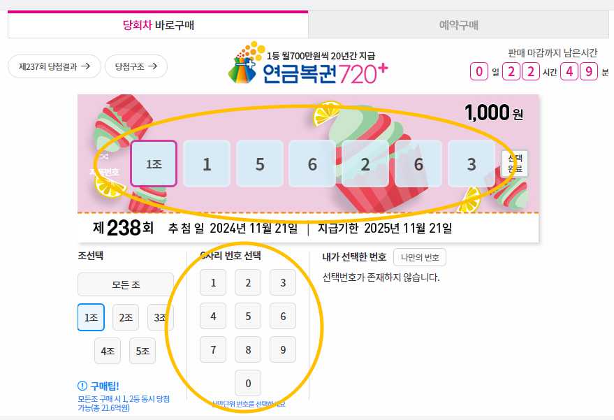 7) 위에 복권그림이 있는 부분에 네모칸을 하나씩 클릭하면서 조 번호와 6자리 번호를 입력해줍니다.