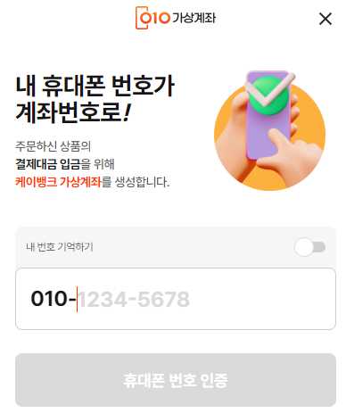 5) 인증번호를 입력하면, 인증받은 나의 휴대폰 번호로 케이뱅크 가상계좌가 개설이 됩니다. 해당 계좌로 송금을 하면 충전이 됩니다.