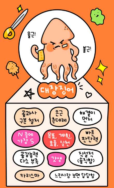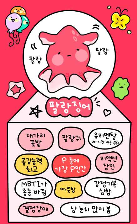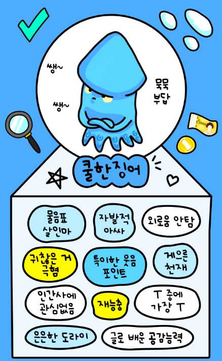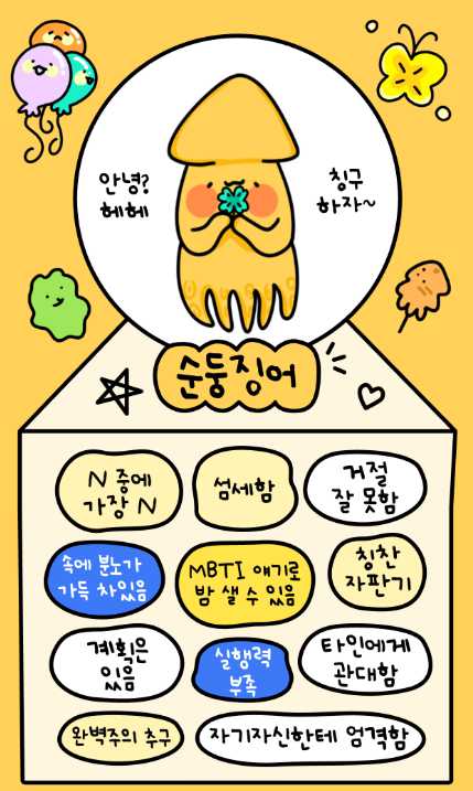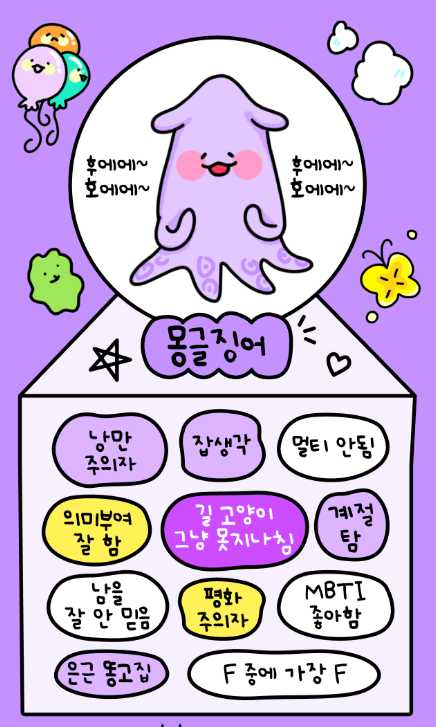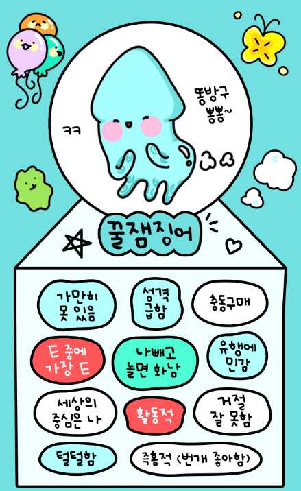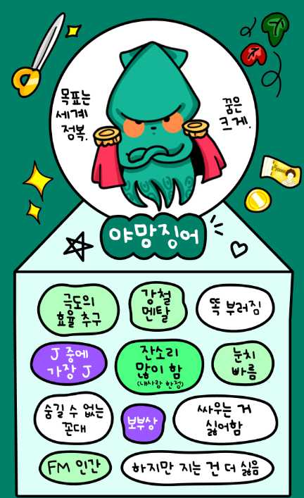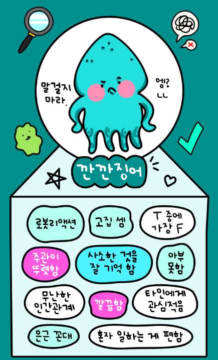 오징어테스트 결과에서 나온 여러가지 오징어들은 MBTI와 관련이 있는데요, 각 오징어마다 해당하는 MBTI를 알려드리겠습니다.
