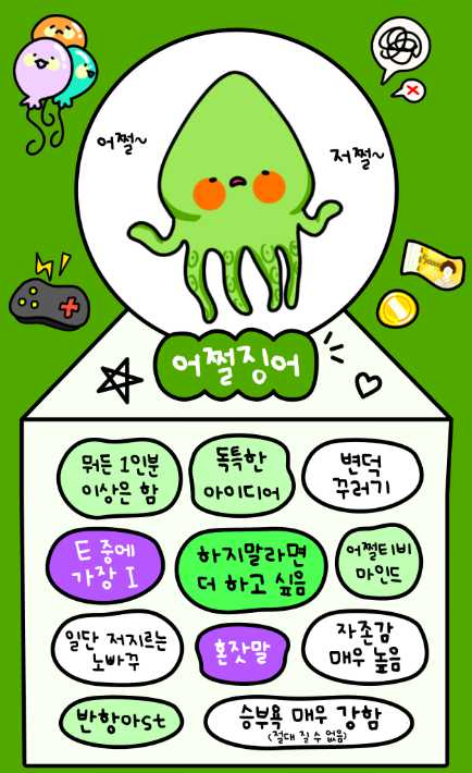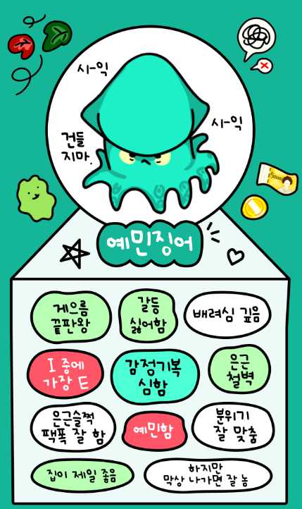 어쩔징어는 E성향이지만 I의 성향도 비중이 높은 편이며 승부욕이 강합니다. 예민징어는 태생적으로 게으른 성격이며 감정기복이 심한 편이고, 쿨한징어는 재능은 많지만 귀찮은 것을 싫어하고 현실적인 성격입니다.