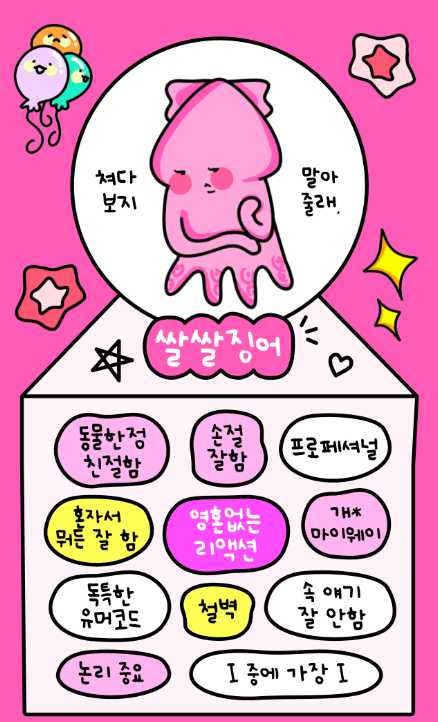 순둥징어는 완벽을 추구하지만 실행력은 떨어지는 특징이 있고, 쌀쌀징어는 내성적인 성향이 가장 강하다고 할 수 있고 논리적입니다.