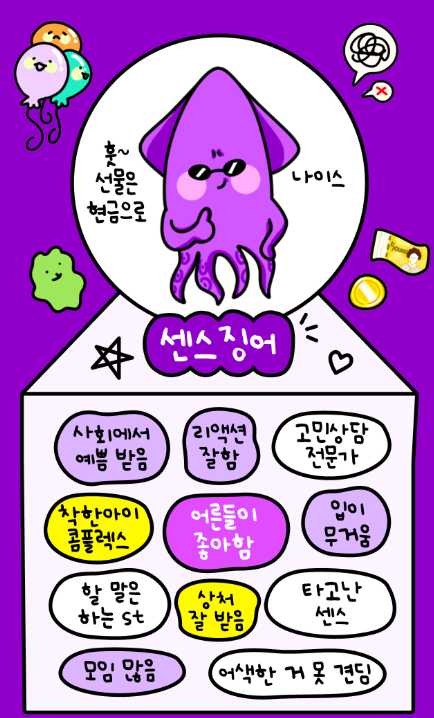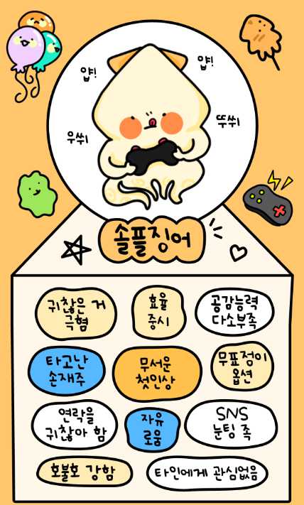 몽글징어는 감정적인 면이 강하고 낭만주의자 성향이고 센스징어는 센스가 있어서 직장 상사나 사회에서 이쁨을 받는 스타일입니다. 솔플징어는 자유분방한 성격으로 다른 사람들에게 관심이 거의 없습니다.