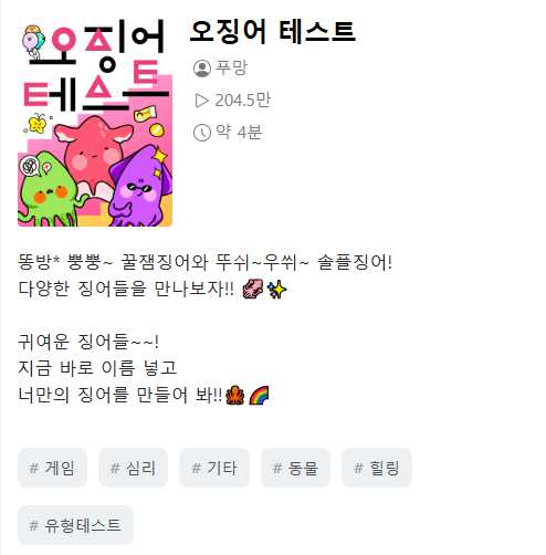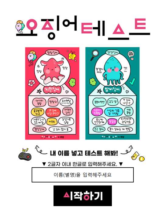 - 테스트 결과를 통해 본인이 무슨 오징어인지 결과를 확인할 수 있습니다.