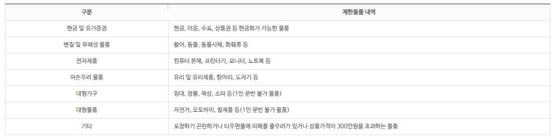 현금이나 수표, 상품권이나 변질되거나 부패될 가능성이 있는 경우, 파손될 우려가 있는 제품, 초대형제품 등은 취급이 제한되니 참고하시기 바랍니다.