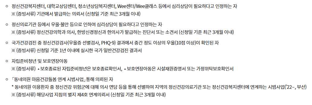 - 정신의료기관 등에서 우울과 불안 등으로 심리상담이 필요하다고 인정을 하는 자여야 합니다. 의사가 발급하는 진단서나 소견서를 증빙서류로 제출해야 합니다.