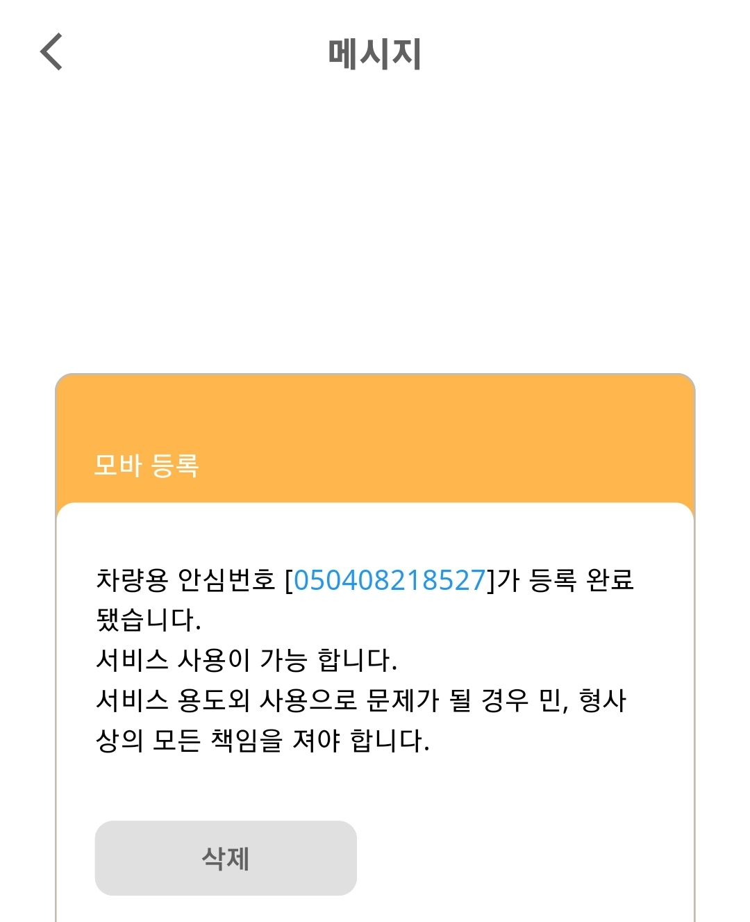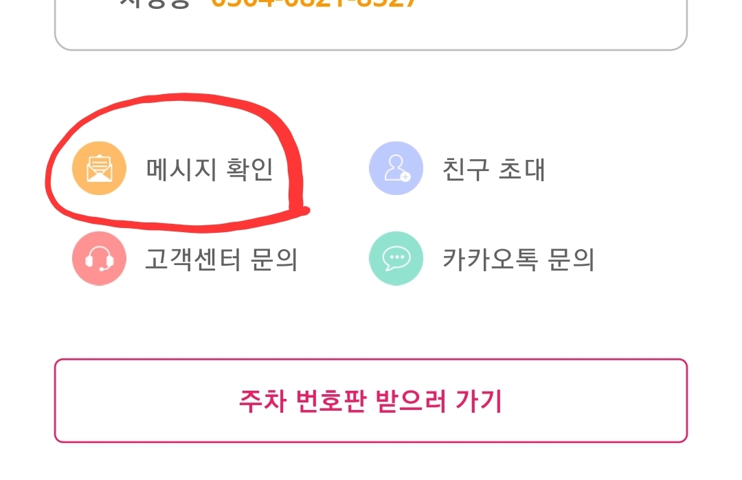 8) 주차 안심번호가 정상적으로 발급이되어 번호가 표시된걸 확인할 수 있고, 메시지확인을 들어가서 알림이나 메시지, 상대방 번호 등을 확인할 수 있습니다.