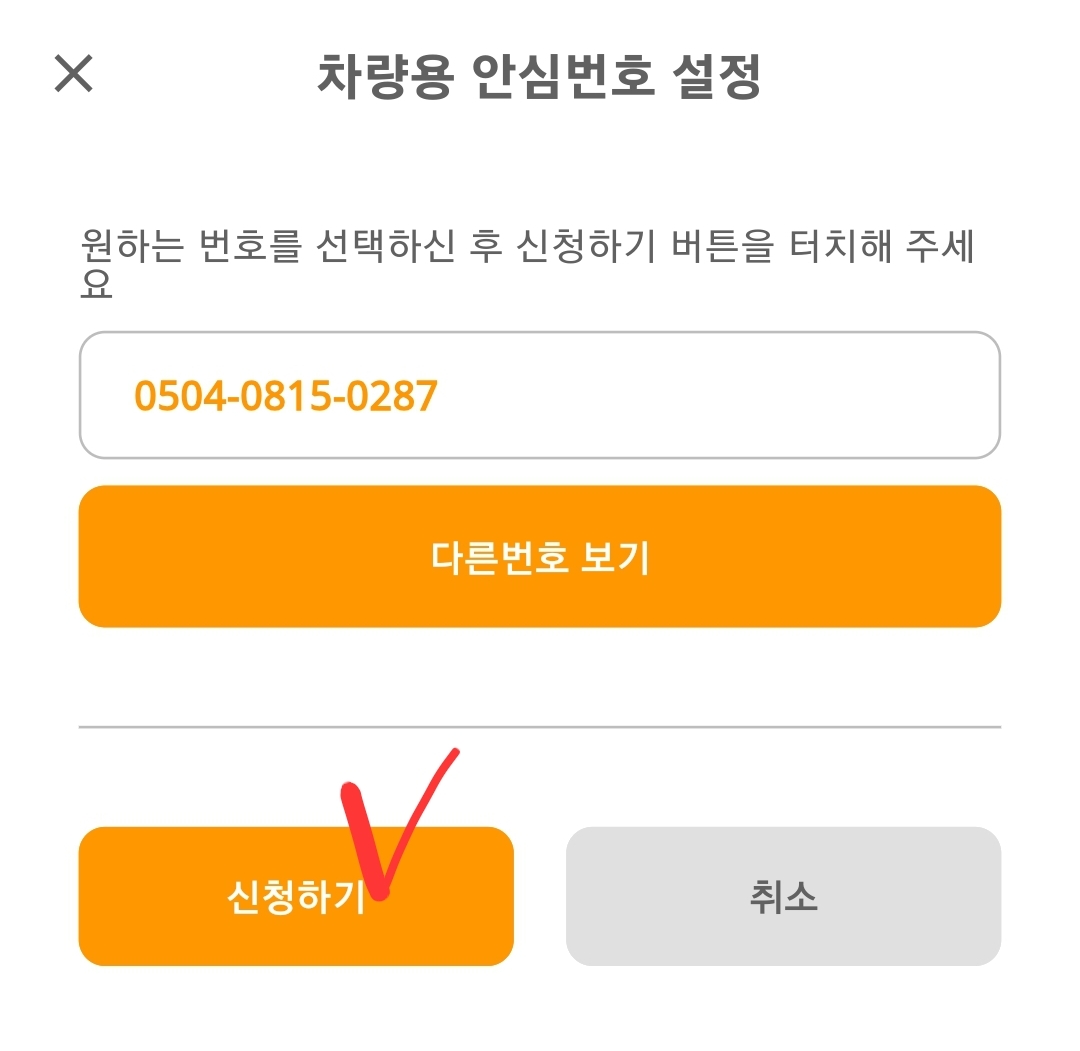 5) 안심번호 신청을 누른 후, 자동으로 안심번호가 표시되면 '다른번호보기'를 눌러서 마음에 드는 번호로 정한 뒤에 신청하기를 누르면 됩니다.