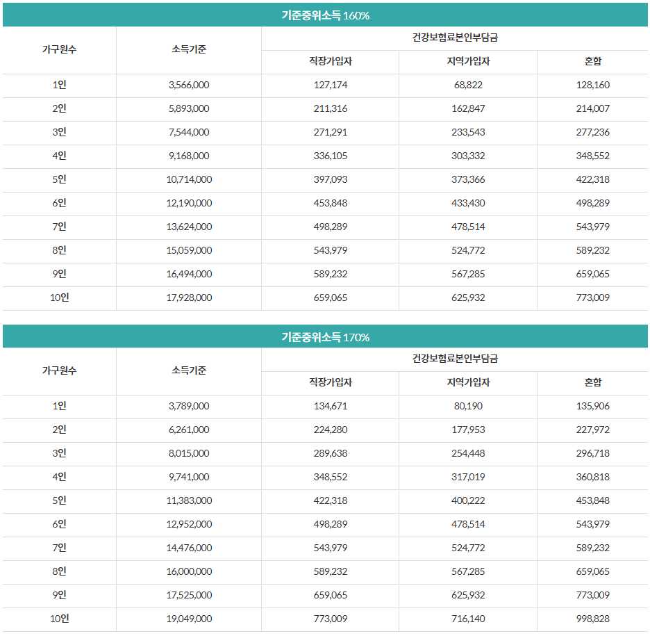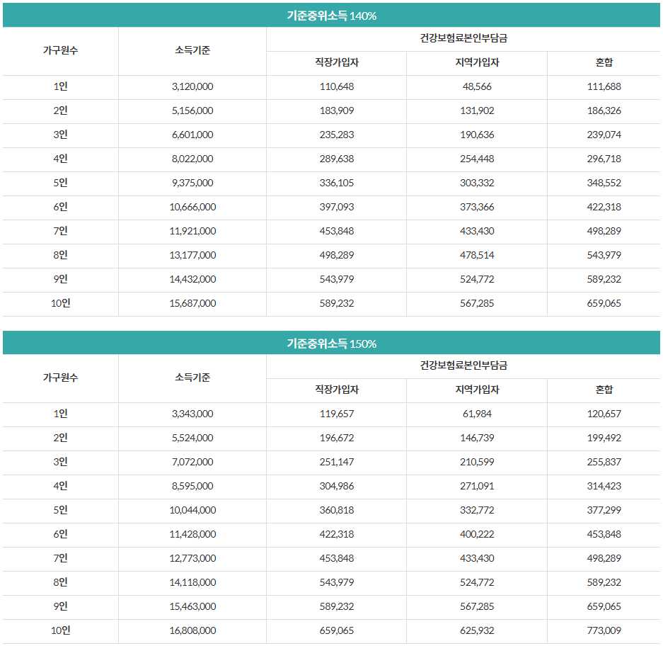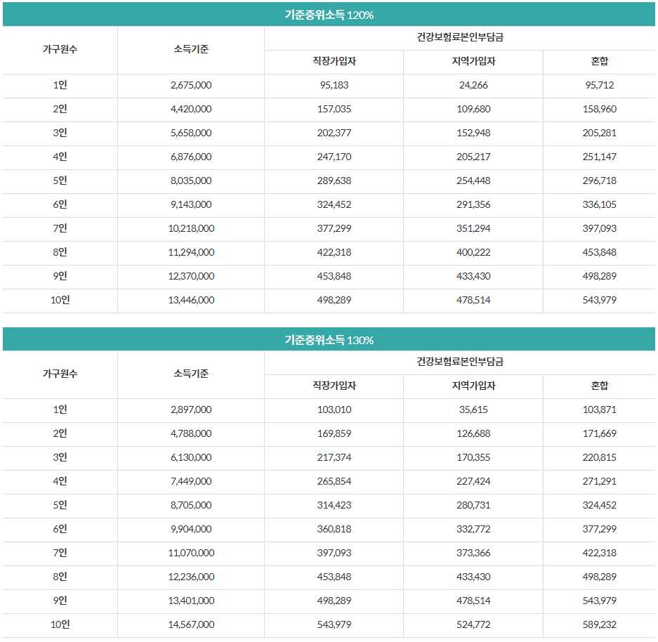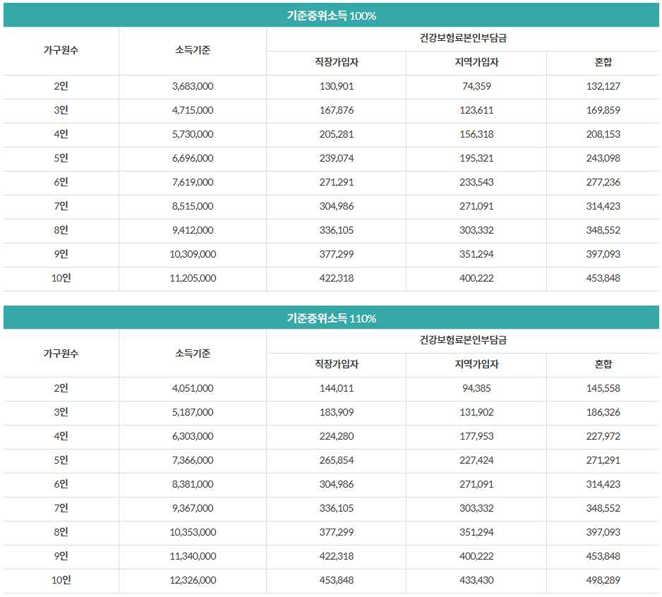 가구원수가 많아질수록 소득기준도 높아지며, 건강보험료 금액도 높아지게 됩니다.