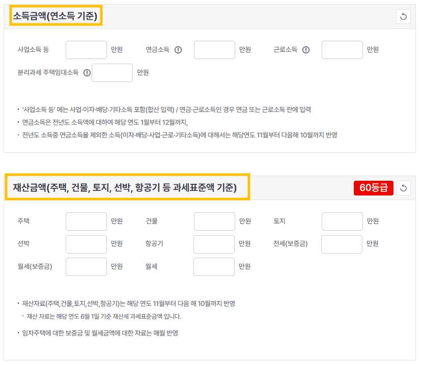 2) 소득금액과 재산금액을 입력하는 칸들이 보이실겁니다. 연소득 기준으로 소득금액을 정확하게 입력을 해주시고, 재산금액은 본인이 소유한 주택이나 건물, 토지, 선박, 항공기, 전월세 등 해당하는 부분을 입력해줍니다.