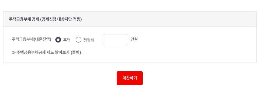 3) 주택금융부채 공제 대상에 해당한다면 입력을 해주시고 아래에 계산하기를 누르면 지역가입자 건강보험료 계산이 완료되어, 금액을 확인하시면 됩니다.