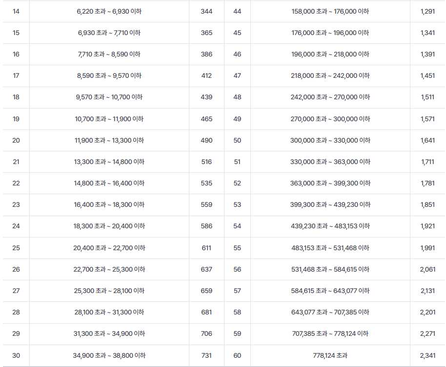 이렇게 소득 기준은 월 소득에 따라서 정률제로 계산이 되고, 재산은 총 60등급 단계로 나눠서, 점수를 부과하여 보험료를 산정하게 됩니다.