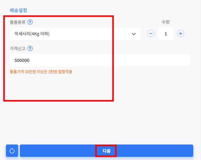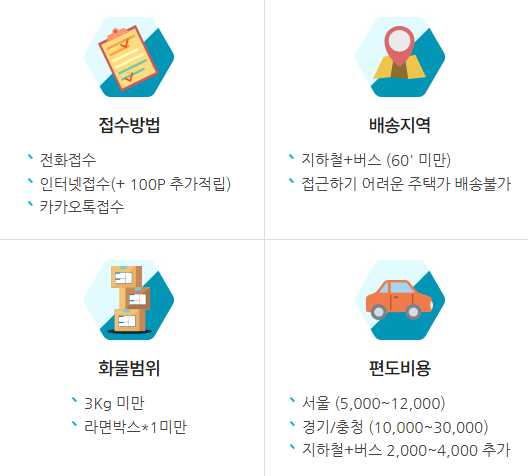 - 추가 요금: 배달할 물건의 가격이 일정금액 이상일 경우에 할증료 2,000 ~ 3,000원 추가