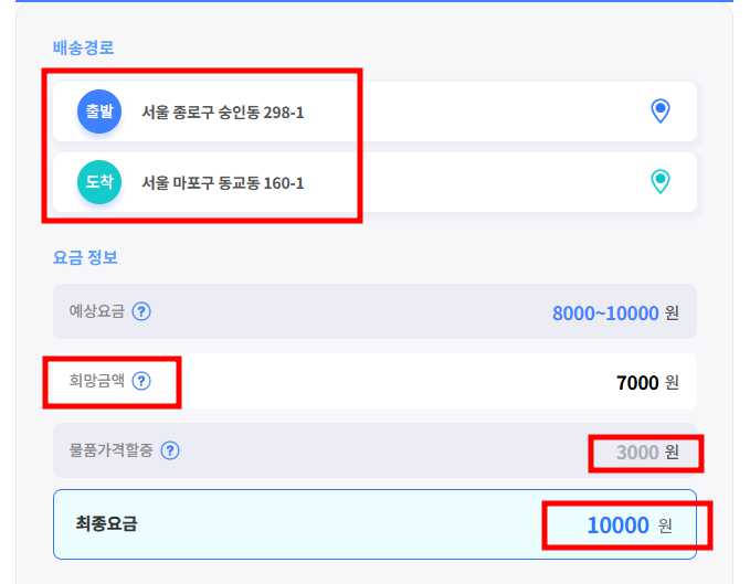 - 요금정보란에서 예상요금을 확인할 수 있으며, 본인이 희망하는 요금을 적어서 접수를 할 수도 있습니다.