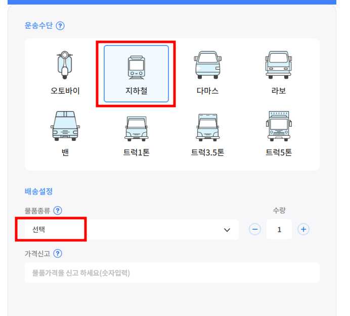 - 운송수단에서 지하철을 선택하고 물품 종류 중에 해당하는 항목을 선택합니다.