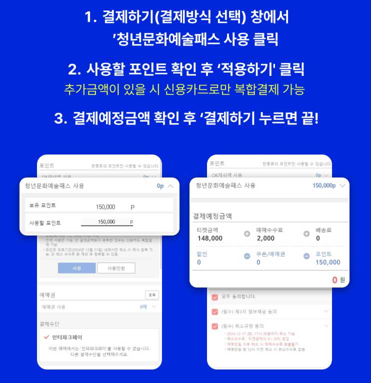 원하는 공연을 예매하기를 눌러서 결제를 할때 청년문화예술패스 상품권이나 포인트 등을 사용해서 예매를 진행하시면 됩니다.
