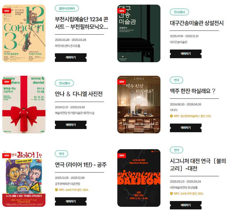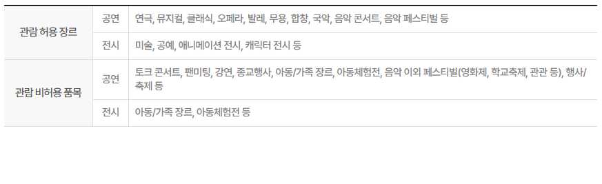 - 관람 가능 분야: 공연(연극, 뮤지컬, 클래식, 국악, 콘서트 등) 및 전시 관람 가능