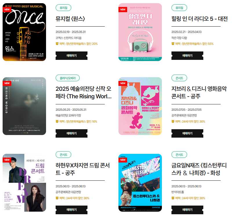 청년문화예술패스 사용처는 발급이 완료되었다면, 청년문화예술패스 공식 누리집 홈페이지에서 원하는 공연 및 콘서트를 찾아보고, 예매해서 관람하시면 됩니다.
