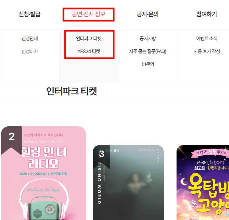 메뉴 공연·전시 정보에서 인터파크 티켓이나 YES24 티켓으로 들어갑니다.