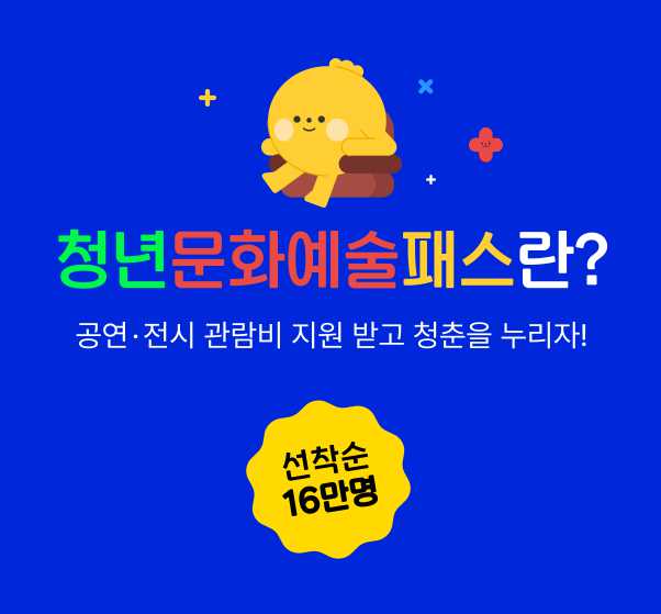 청년문화예술패스는 우리나라 국적을 가진 만 19세 청년들에게 공연 및 전시 관람 비용을 지원하는 사업인데요, 2025년 기준으로 2006년생들이 대상이며, 이제 막 성인 된 청년들이 문화시민으로 거듭날 수 있도록 기회를 제공하고 문화예술 소비를 촉진하기 위해서 문화체육관광부와 한국문화예술위원회를 통해서 시행이 되고 있습니다.