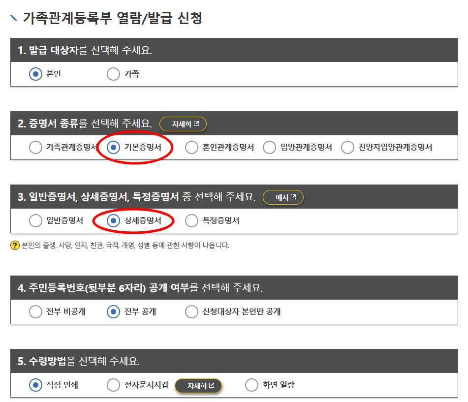 3) 발급시 대상자는 본인과 가족 중에 선택을 해주시면 되고, 증명서 종류는 기본증명서로 해야합니다. 그리고 아래 선택사항에서는 상세증명서로 하고 주민번호는 모두 공개로 선택을 해서 발급을 받으시면 됩니다.