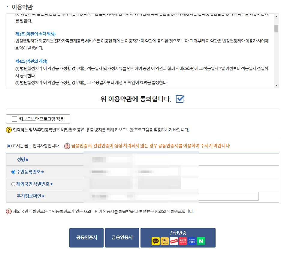 2) 동의내용을 읽어주시고 체크를 한 뒤, 이름과 나머지 사항을 적어서 본인인증을 해줍니다.