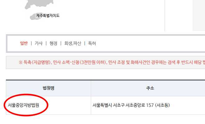 두가지 모두 지역을 쓰고 검색을 누르면 아래에 관할 법원이 표시됩니다.