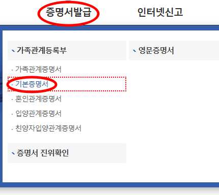 1) 먼저 해당 홈페이지에서 상단메뉴에서 '증명서발급 > 가족관계등록부 > 기본증명서'를 들어갑니다.