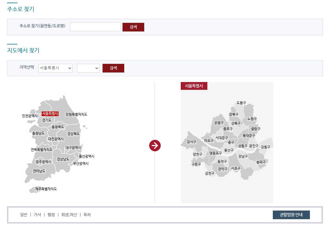 가정법원이 없는 지역도 있기 때문에 이럴때는 지방법원을 가셔야 하는데요, 해당 주소에 있는 법원을 빠르게 찾을 수가 있습니다.