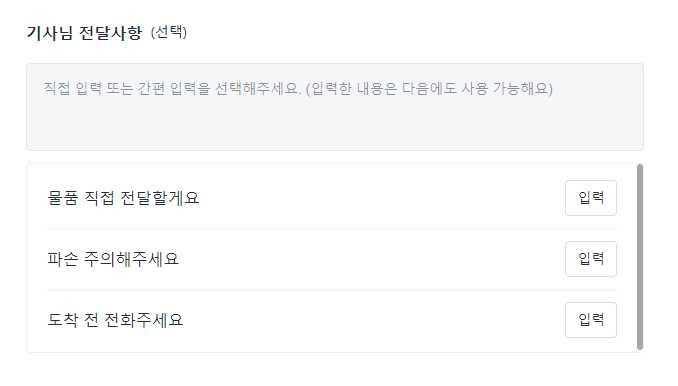 6) 전달사항이 있으면 작성을 해줍니다. 물건을 직접 전달하기 어려운 상황이라면 경비실이나 다른 곳에 보관 후, 그 곳에서 가져가 달라고 하셔도 됩니다.