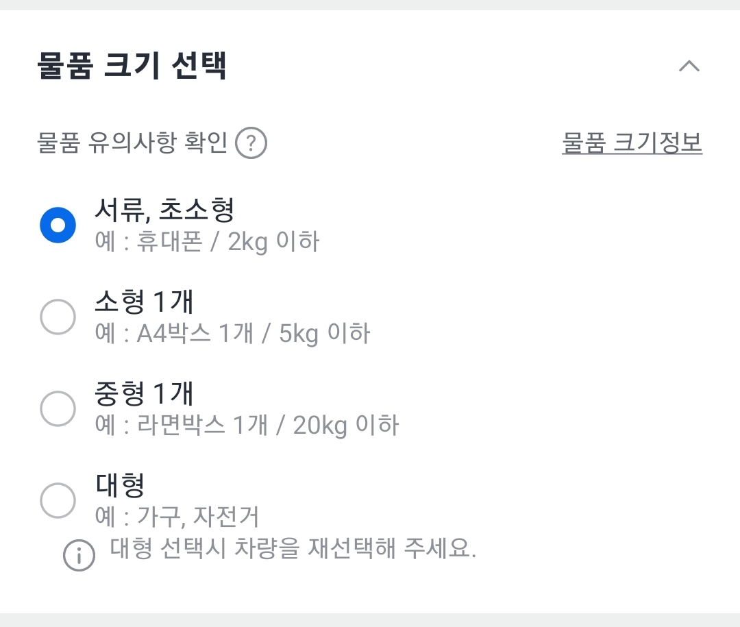 퀵 보낼 물건의 크기나 중량을 선택해줍니다.