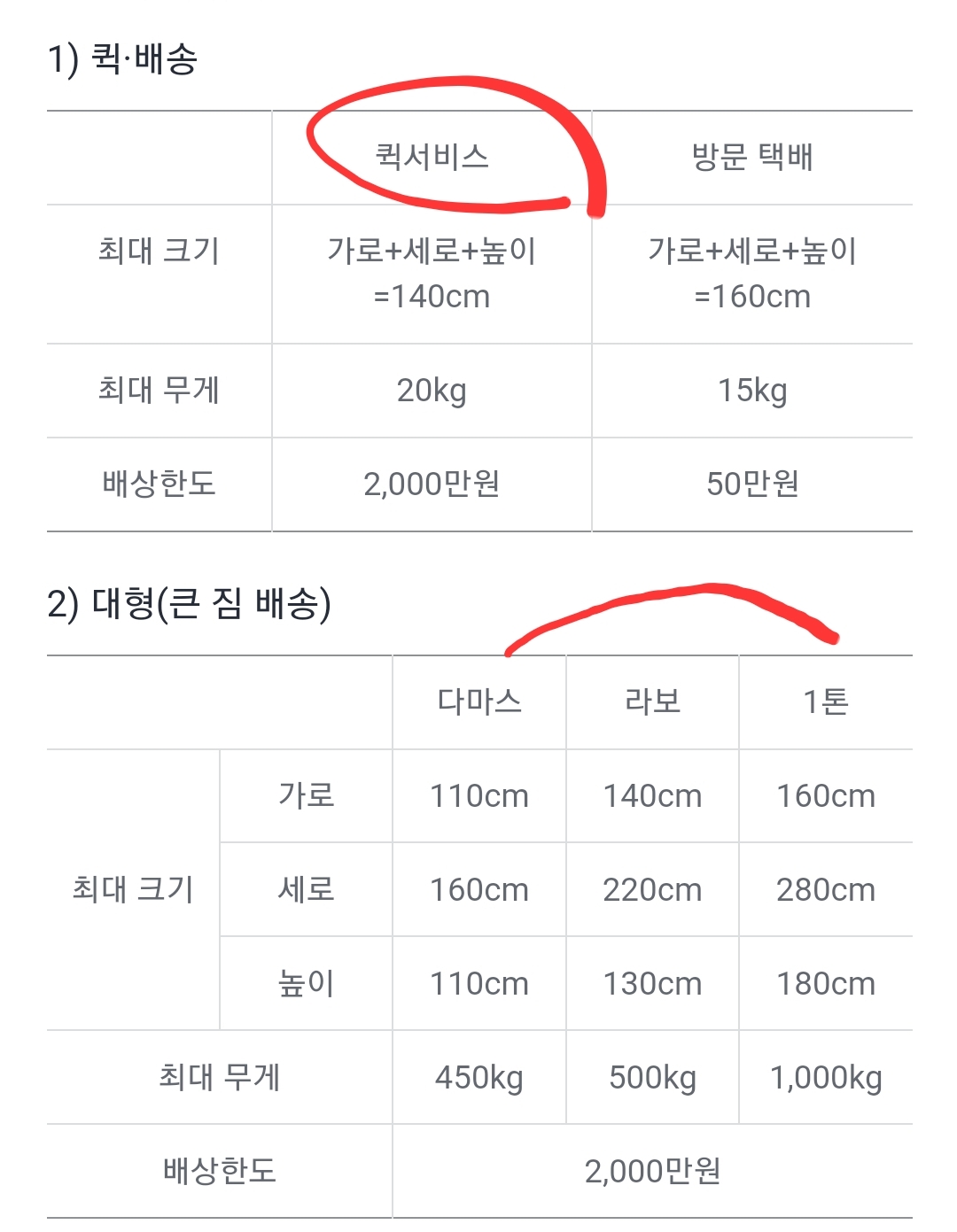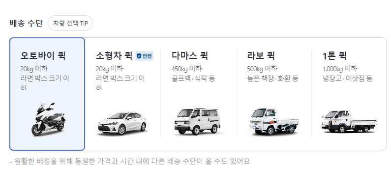 4) 배송 수단에서 오토바이, 소형, 다마스, 라보, 1톤 중에 원하는 것을 선택해줍니다. 소형은 오토바이를 선택하는게 가장 좋고, 대형은 다마스나 1톤을 선택해서 보낼 수 있습니다. 1톤은 이사를 할때도 이용이 가능하니, 물건의 규모에 따라 정해줍니다.