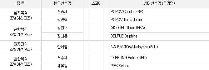 - 혼합 복식 B조: 서승재/채유정, 푸아바라누크로/타에라타나차이(태국), 타벨링/피에크(네덜란드), 마메리/마메리(알제리)