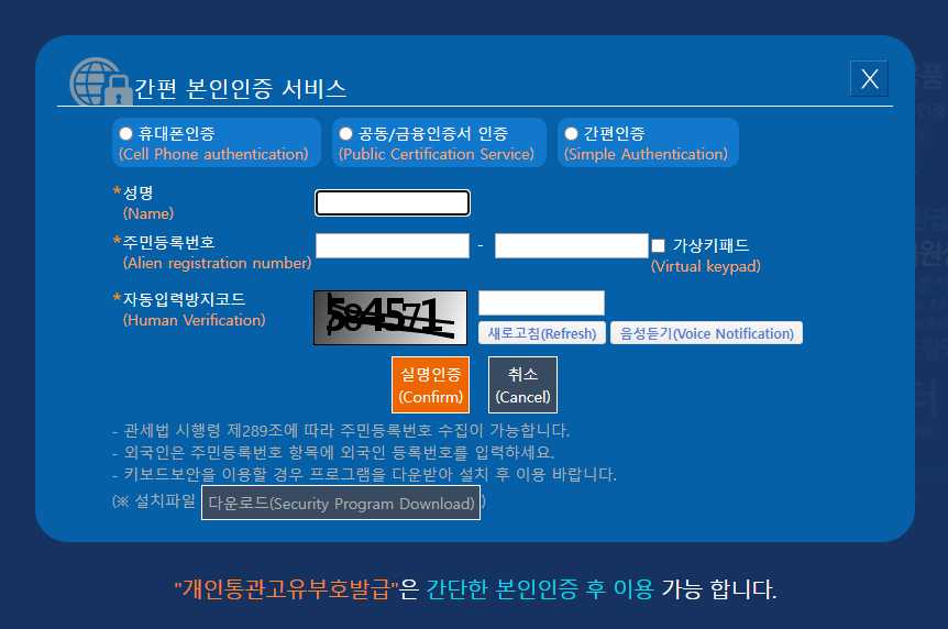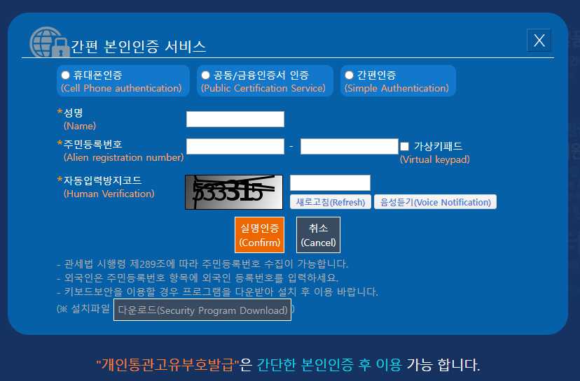 4) 성명, 주민번호, 자동입력방지코드를 입력하고 '실명인증'을 눌러서 인증을 진행하면 통관번호 발급이 완료됩니다.