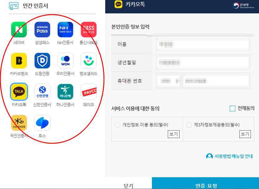 5) 저는 간편인증에서 카카오톡을 이용해주었습니다.