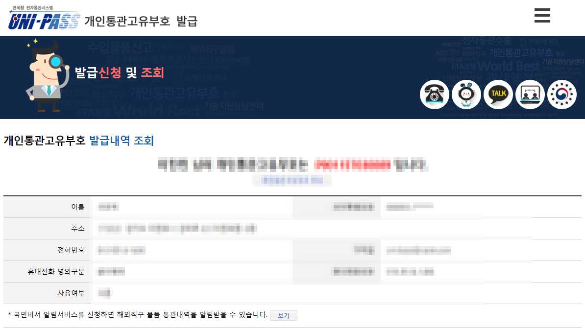 보통 통관번호를 한번쯤은 발급 받으셨을텐데, 아직 한번도 발급을 안받으신 분들도 계시기 때문에 발급방법에 대해서도 알아보겠습니다. 만약 통관번호를 분실한 경우, 유니패스 사이트에 다시 접속하여 본인 인증을 거쳐 통관번호를 조회나 발급을 받을 수 있습니다.