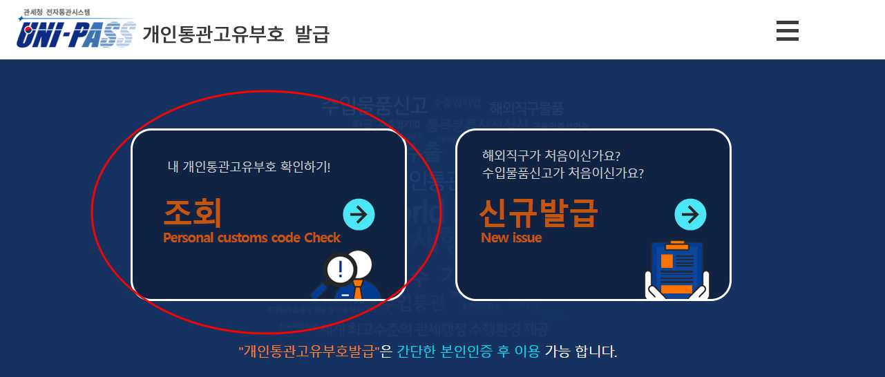 2) 메인화면에서 내 개인통관고유부호 확인하기 탭에 '조회'를 누릅니다.