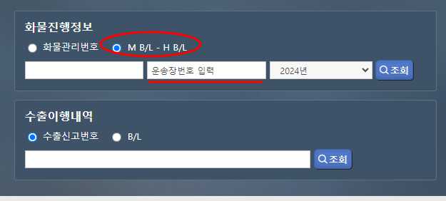 2) 우측에 있는 화물진행정보 탭에서 화물관리번호로 체크가 되있는것을 'M B/L - H B/L'로 체크합니다.