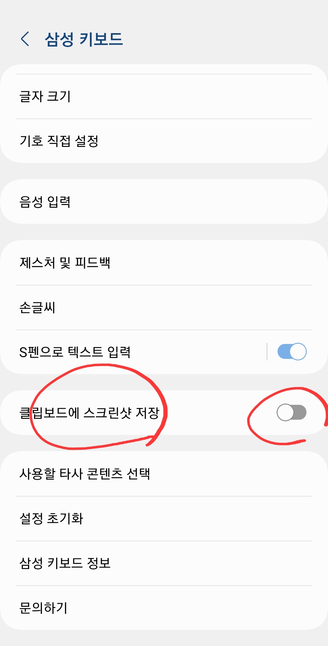키보드 설정에 들어오셨으면 '클립보드에 스크린샷 저장' 이라는 탭이 보이실텐데요, 오른쪽에 해당 버튼을 켜주면 스크린샷을 하였을때 클립보드에 저장이 되게 됩니다. 그러면 똑같이 점세개를 눌러 클립보드에서 불러오기를 통하여 사용하실 수 있습니다.