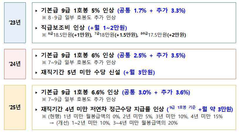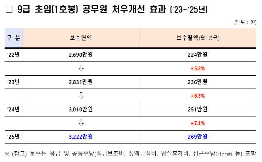 2025년에는 군인을 포함한 모든 공무원의 월급이 기본적으로 3%가 인상이 되었고, 근무한지 얼마 되지 않은 초임 저연차의 경우에는 3~3.6% 추가 봉급이 인상되었습니다.