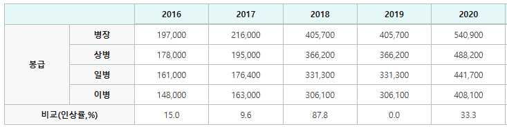 병사의 월급도 인상이 되어 계급별로 작년 대비 11~25만원까지 인상이 되었고, 군인 병사 월급 인상률은 20%입니다.