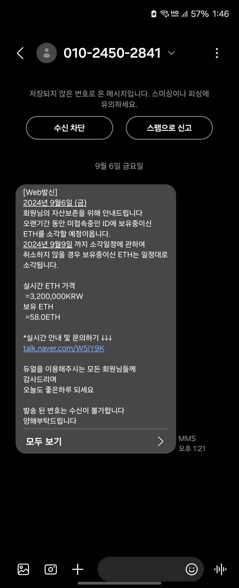 이 문자는 이더리움 가상화폐를 갖고 있지 않은 사람들에게도 무지성으로 발송이 된 것으로 확인이 됩니다. 만약 ETH를 갖고 있다고 하더라도 신경 쓰지 않으셔도 됩니다.