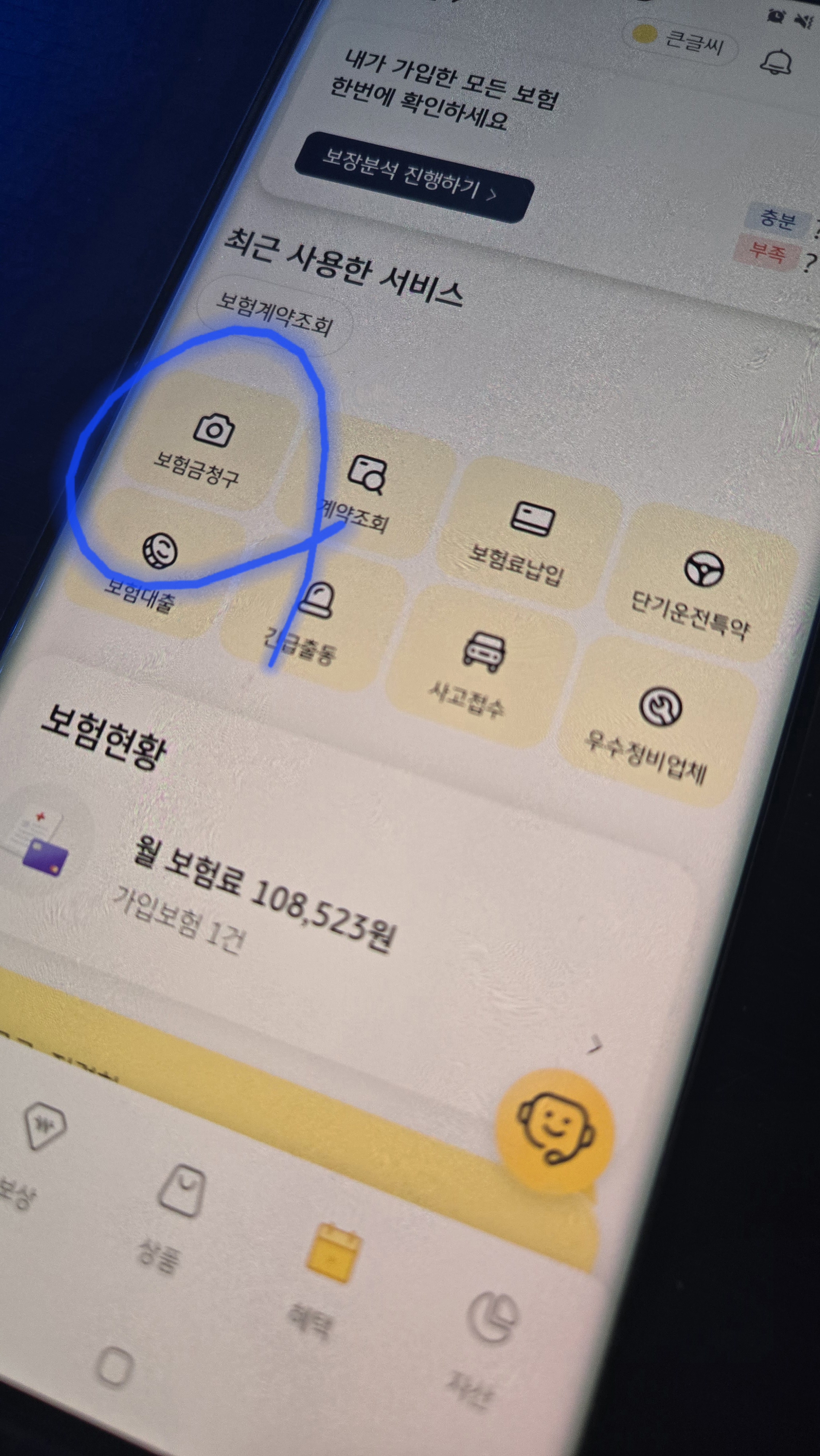 KB손해보험 실손 청구방법은 해당 앱을 설치하고 들어가면 메인화면에서 보험금청구를 눌러줍니다.