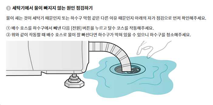 - 세탁기에 물이 제대로 나오거나 고여있는지 확인합니다.