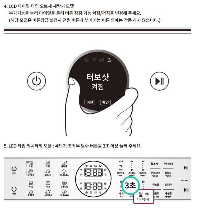 - 버튼잠금이 있는 기종은 탈수 버튼과 물온도 버튼을 동시에 3초이상 누릅니다.