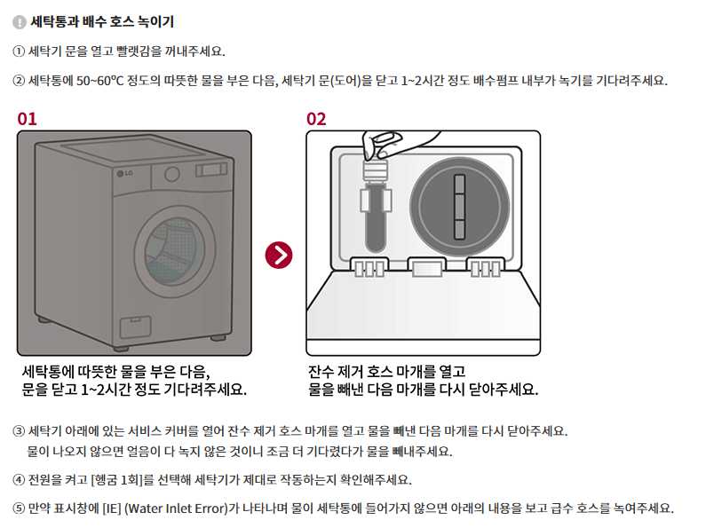 - 세탁통, 호스 등을 따뜻하게 만들어서 해동을 시키고 다시 시도합니다.