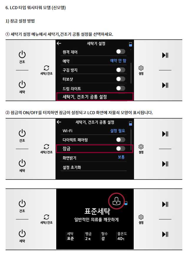 - lg 워시타워 모델은 '세탁기설정 > 공통설정 > 잠금'에서 설정을 할 수가 있고, 자물쇠 모양을 길게 누르면 해제 됩니다.