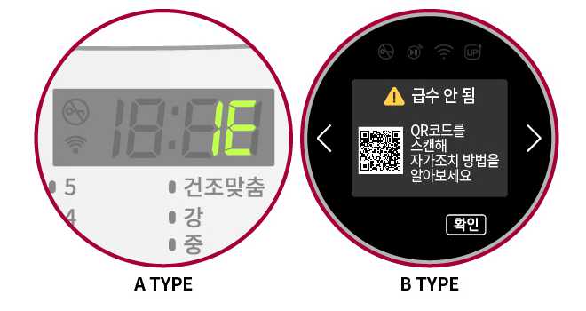 - 이상이 없는데도 에러가 나온다면, 전원을 끄고 코드를 뽑고 5~10분 뒤에 다시 켜서 세탁을 해봅니다.